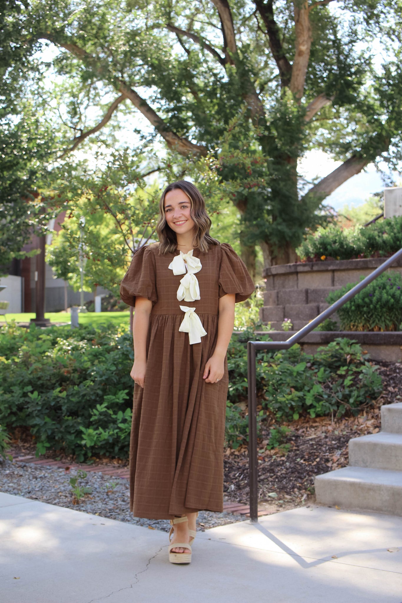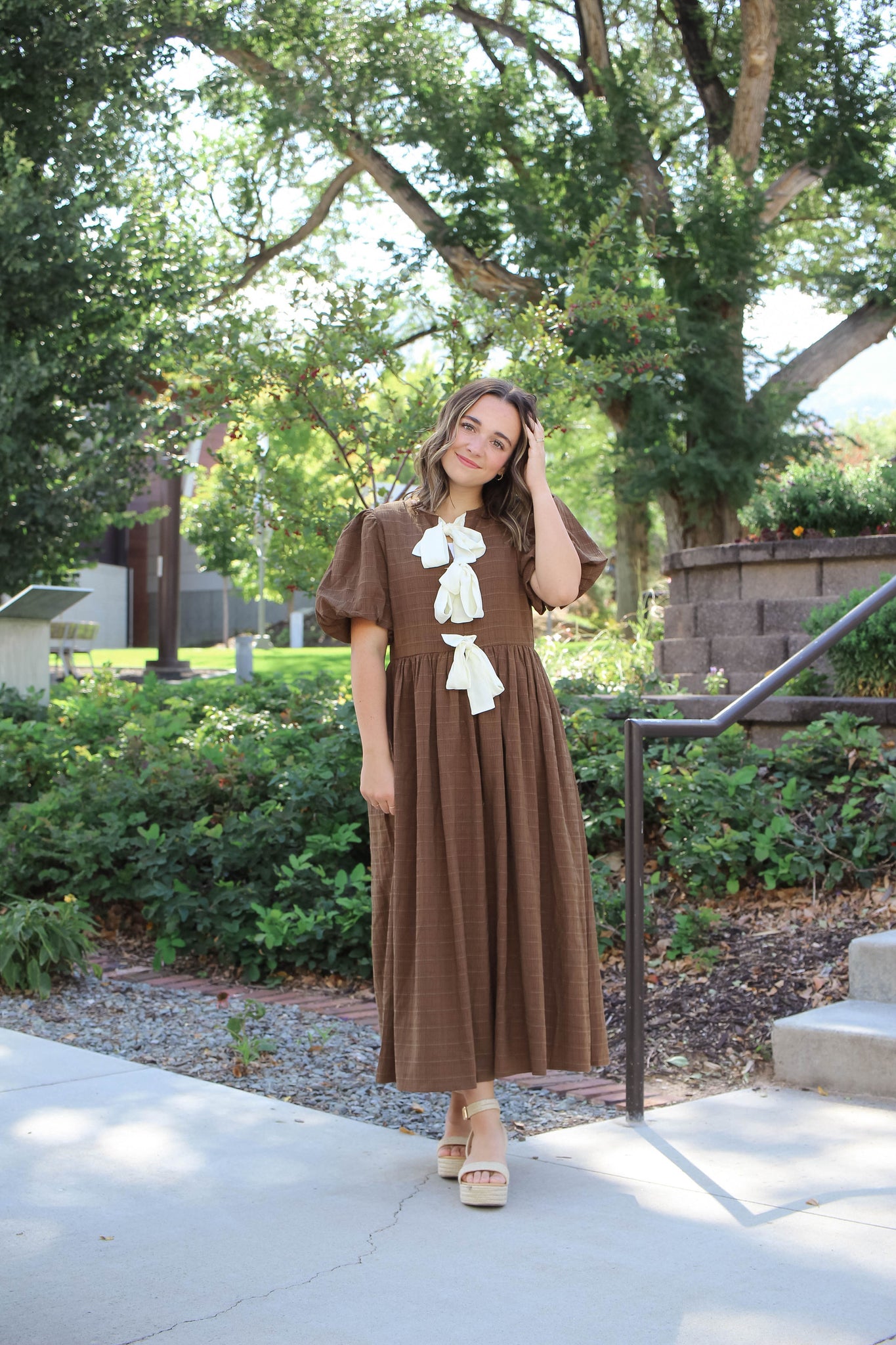 a new twist on one of our favorite and best selling tops- now in a dress! soft bubble sleeves and a trio of oversized bows along the front bodice, this midi dress strikes a perfect balance between playful and refined. the relaxed silhouette is effortlessly flattering, with a roomy skirt that flows with every step. don't forget our favorite- pockets!