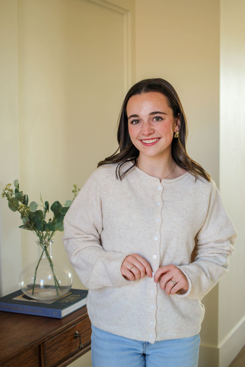 our staple, best selling cardigan. the perfect piece to transition into spring. layer as needed in colder months and days, or wear alone sweater when it starts warming up- this knit is lightweight and a classic. features a rolled collar, button-down front, and long sleeves with dropped shoulders. has a regular length, ribbed hem detail, and a versatile enough for year round wear.