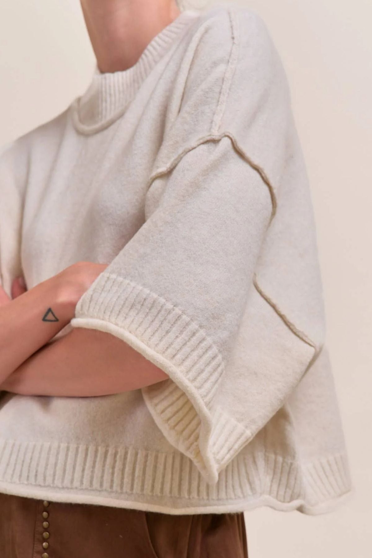 marled knit mock neck short sleeve sweater with a mock neckline, raw edge seam detail, wide short sleeves, a semi-cropped bodice, and ribbed neckline, cuffs, and hem. see all available colors here.