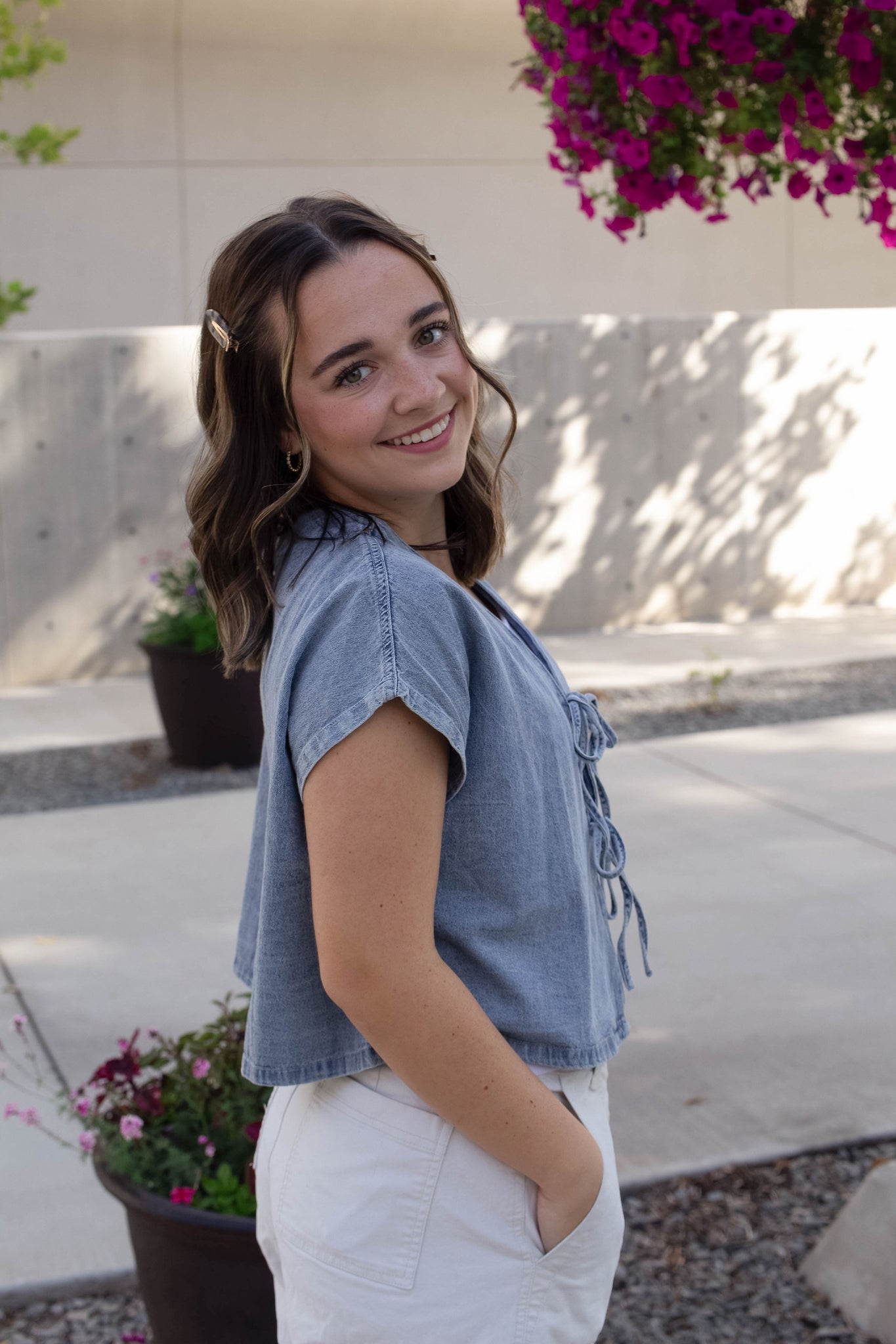 denim top with ties down the front. layers cute with a tee, tank, or dress. lightweight.